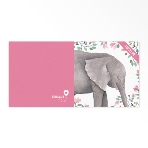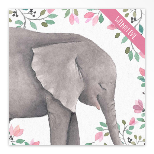 Dit schattige geboortekaartje (11 x 11 cm) met het aandoenlijke olifantje is om kriebels van te krijgen. De fijne illustraties en kleuren maken het kaartje extra lief. De naam van jullie kleine staat op de voorzijde en de volledige gegevens staan aan de binnenzijde. We verwerken graag jullie favoriete gedichtje aan de binnenzijde. We drukken op hoogwaardig papier dat met zorg is uitgekozen.