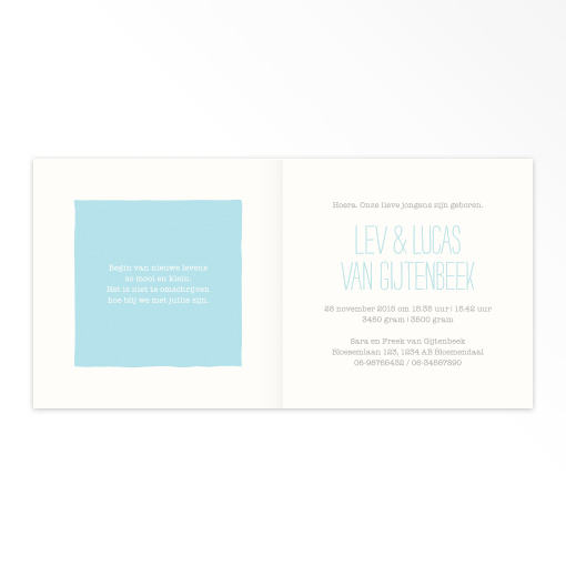 Dit lieve geboortekaartje (11 x 11 cm) met de kleine vrolijke hummels maakt iedereen blij. De naam en gegevens van jullie tweeling staan aan de binnenzijde. De schattige typografie maakt het kaartje extra bijzonder. We drukken op hoogwaardig papier dat met zorg is uitgekozen. De enveloppen zijn een cadeau van ons en zitten er gratis bij. De kleurtjes kunnen we op verzoek aanpassen.