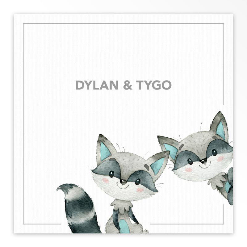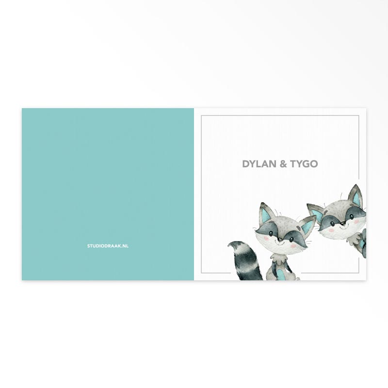 Dit geboortekaartje voor tweelingen (11 x 11 cm) is lekker vrolijk met de kleine wasbeertjes. De details en lieve kleurtjes maken het kaartje extra bijzonder. De namen van jullie kleintjes staan op de voorzijde en de overige gegevens aan de binnenzijde. We drukken op hoogwaardig papier dat met zorg is uitgekozen. De enveloppen zijn een cadeau van ons en zitten er gratis bij.