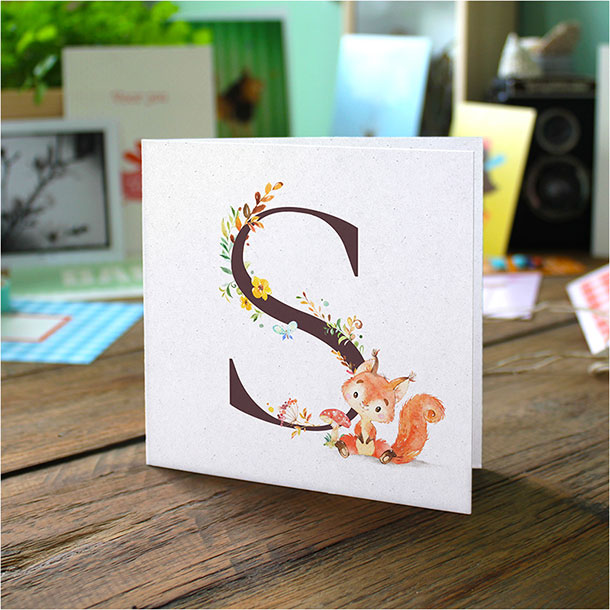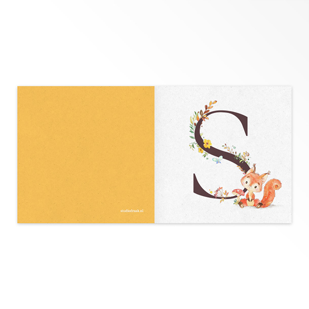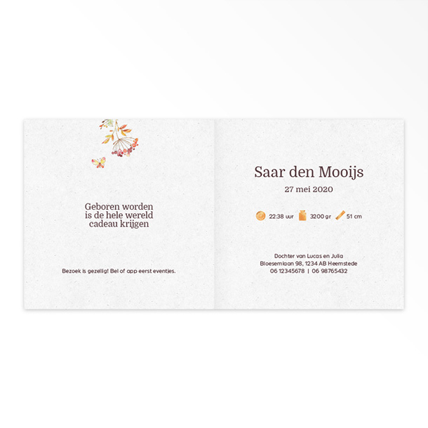 Dit gevouwen geboortekaartje (11 x 11 cm) is heel fleurig met het lieve diertje en de kleurrijke plantjes. Van dit ontwerp kunnen we elke letter uit het alfabet realiseren. De voorletter van jullie kleine staat op de voorzijde en de overige gegevens staan aan de binnenzijde. We drukken op hoogwaardig papier dat met zorg is uitgekozen. Alle prijzen inclusief drukkosten en gratis enveloppen.