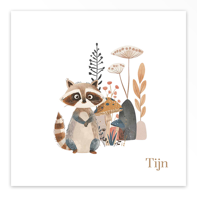 Dit geboortekaartje (11 x 11 cm) is heel lief met de schattige wasbeer en de eigentijdse kleuren. De naam van jullie kleine staat op de voorzijde, de overige gegevens aan de binnenzijde. We drukken op hoogwaardig papier dat met zorg is uitgekozen. Alle prijzen inclusief drukkosten en gratis enveloppen.