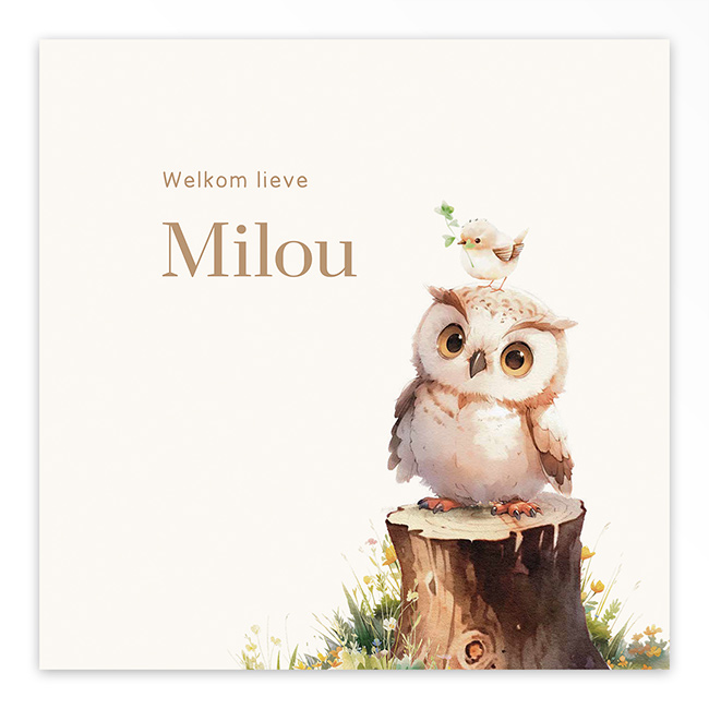 Dit geboortekaartje (11 x 11 cm) is heel lieflijk met de schattige diertjes en zachte kleuren. De naam van jullie kleine staat op de voorzijde, de overige gegevens aan de binnenzijde. We drukken op hoogwaardig papier dat met zorg is uitgekozen. Alle prijzen inclusief drukkosten en gratis enveloppen.