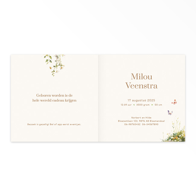 Als een proefkaartje in de smaak valt verzorgen we graag een gepersonaliseerde opmaak waarin we de – voorlopige – gegevens verwerken. Dat voorbeeld versturen we per e-mail. Zo werken we samen toe naar een fijngeslepen ontwerp, waarin we na de geboorte alleen nog de laatste gegevens hoeven te verwerken. Tegen die tijd sturen we nogmaals een PDF ter controle, waarna we zo snel mogelijk het drukproces opstarten. Onze drukkerij doet altijd z’n uiterste best drukwerk dezelfde werkdag al verzendklaar te maken, afhankelijk van ’t moment van aanleveren.