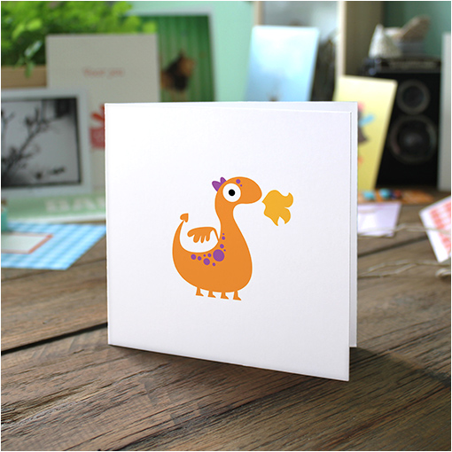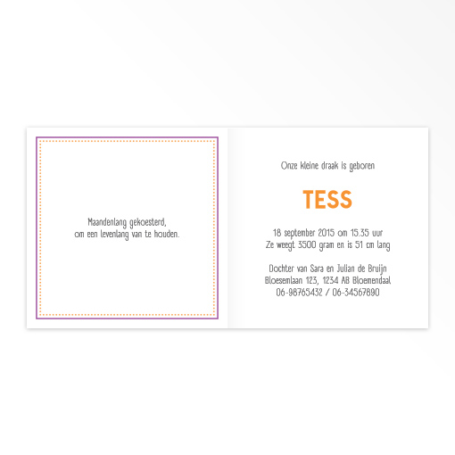 Dit gevouwen geboortekaartje (11 x 11 cm) is heerlijk eigenwijs met de kleine draak. De stevige kleurtjes maken het kaartje helemaal stoer. De gegevens van jullie kleine staan aan de bijpassende binnenzijde. We drukken op hoogwaardig papier dat met zorg is uitgekozen. De enveloppen zijn een cadeau van ons en zitten er gratis bij.