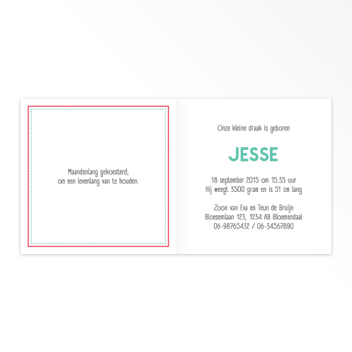 Dit gevouwen geboortekaartje (11 x 11 cm) is heerlijk eigenwijs met de kleine draak. De stevige kleurtjes maken het kaartje helemaal stoer. De gegevens van jullie kleine staan aan de bijpassende binnenzijde. We drukken op hoogwaardig papier dat met zorg is uitgekozen. De enveloppen zijn een cadeau van ons en zitten er gratis bij.