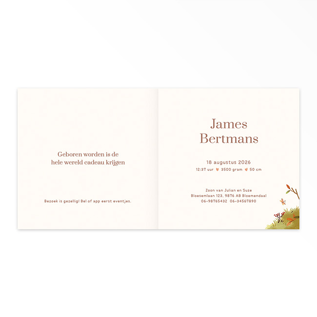 Van jouw favoriete geboortekaartje kun je eenvoudig en kosteloos een proefexemplaar aanvragen via de gele knop op deze pagina. Die versturen we per post. Als het geboortekaartje in de smaak valt verzorgen we graag – geheel vrijblijvend – een gepersonaliseerde opmaak. Dat gepersonaliseerde voorbeeld versturen we per e-mail.