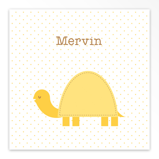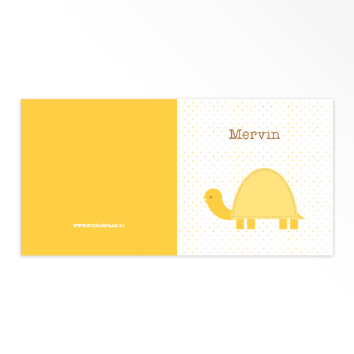 Dit gevouwen geboortekaartje (11 x 11 cm) is helemaal leuk met de stippen en de schattige schildpad. De vrolijke kleurtjes maken het kaartje extra bijzonder. Op de voorzijde staat de naam van jullie kleine en de overige gegevens staan aan de binnenzijde. We drukken op hoogwaardig papier dat met zorg is uitgekozen. De enveloppen zijn een cadeau van ons en zitten er gratis bij.