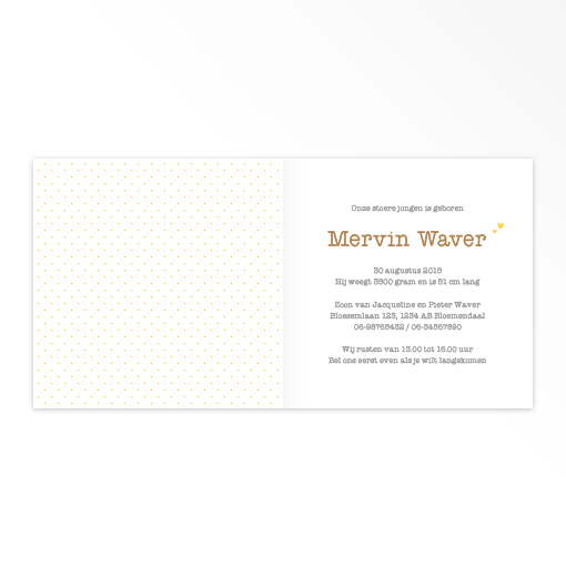 Als een proefkaartje in de smaak valt verzorgen we graag een gepersonaliseerde opmaak waarin we de – voorlopige – gegevens verwerken. Dat voorbeeld versturen we als PDF per e-mail. Zo werken we samen toe naar een fijngeslepen ontwerp, waarin we na de geboorte alleen nog de laatste gegevens hoeven te verwerken. Tegen die tijd sturen we nogmaals een PDF ter controle, waarna we zo snel mogelijk het drukproces opstarten. Onze drukkerij doet altijd z’n uiterste best het drukwerk dezelfde werkdag al verzendklaar te maken, afhankelijk van het moment van aanleveren. Bij vragen helpen we graag: info@studiodraak.nl of kijk eens bij veelgestelde vragen.