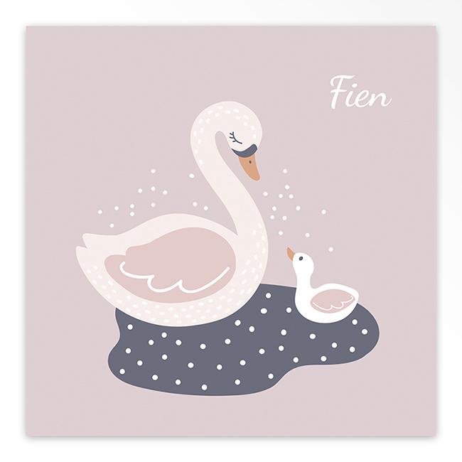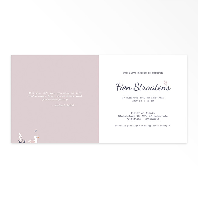 Dit geboortekaartje (11 x 11 cm) is heel lief met de sierlijke zwanen. De eenvoud en fijne kleuren maken dit kaartje extra bijzonder. De naam van jullie kleine staat op de voorzijde, de overige gegevens staan aan de binnenzijde. We drukken op hoogwaardig papier dat met zorg is uitgekozen. Alle prijzen inclusief drukkosten en gratis enveloppen.