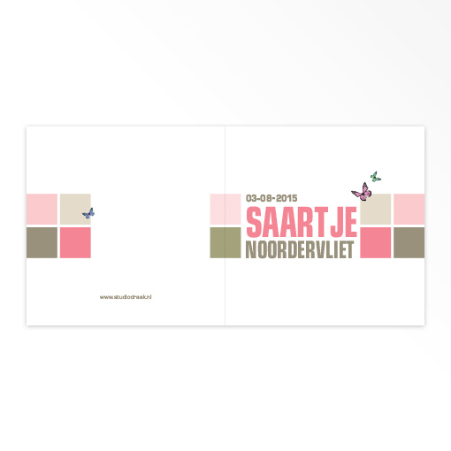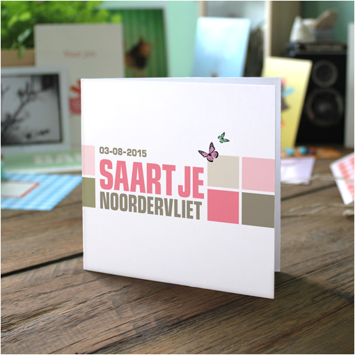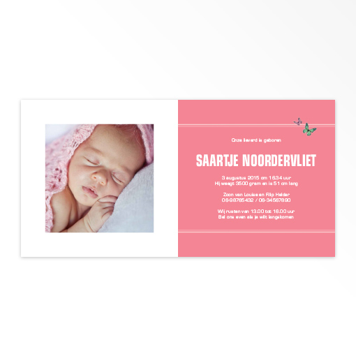 Dit gevouwen kaartje (11 x 11 cm) met vrolijke kleuren is een feest om te versturen. Met een foto aan de binnenzijde staat jullie kleine helemaal centraal. De moderne vlakjes en schattige vlinders maken het kaartje compleet. We drukken op hoogwaardig papier dat met zorg is uitgekozen. De enveloppen zijn een cadeau van ons en zitten er gratis bij.