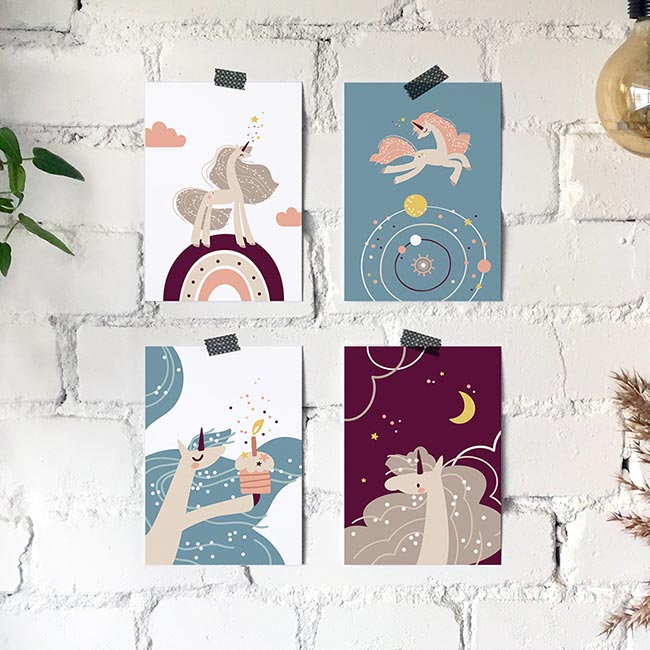 Deze eigentijdse set kaarten (105 x 148 mm) met de eenhoorns is om verliefd op te worden. Een feest om te versturen, maar ook leuk op de muur van een kinderkamer of stoere loft. We drukken op hoogwaardig sulfaatkarton dat met zorg is uitgekozen. Ook verkrijgbaar als losse kaarten! We bezuinigen nooit op drukwerk en kiezen altijd voor de beste materialen ?