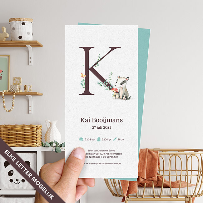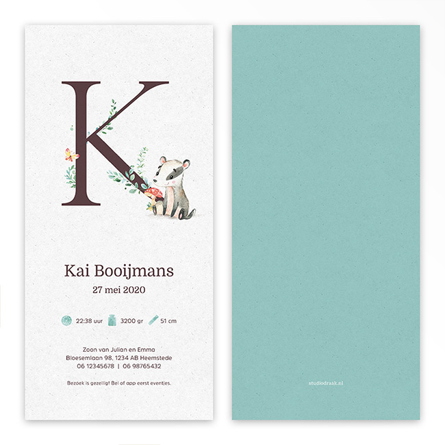 Dit ongevouwen geboortekaartje (10 x 21 cm) is heel fleurig met het lieve diertje en de kleurrijke plantjes. Van dit ontwerp kunnen we elke letter uit het alfabet realiseren. We drukken op hoogwaardig papier dat met zorg is uitgekozen. Alle prijzen inclusief drukkosten en gratis enveloppen.