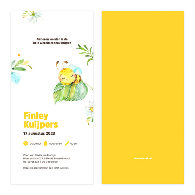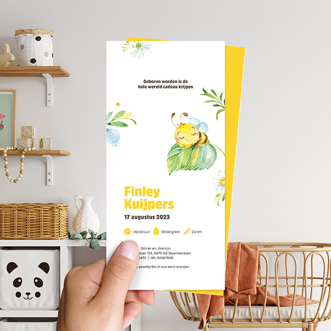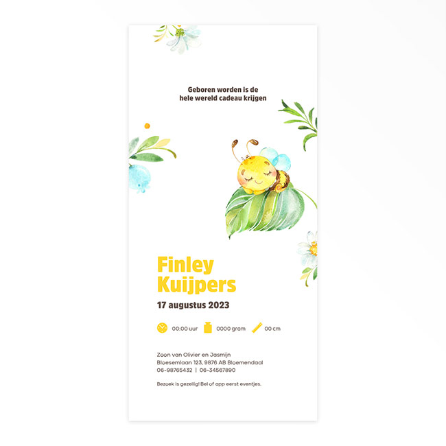 Dit ongevouwen geboortekaartje (10 x 21 cm) is heerlijk fleurig en kleurig met het lieve bijtje. Een feest om te versturen. We drukken op hoogwaardig papier dat met zorg is uitgekozen. Alle prijzen inclusief drukkosten en gratis enveloppen.