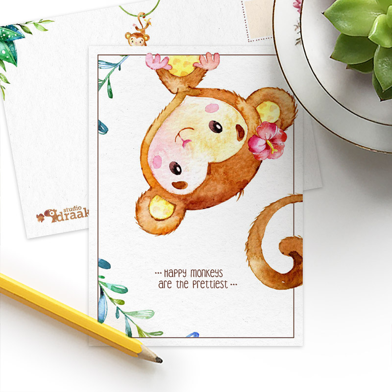 Deze eigenwijze postkaart (105 x 148 mm) met het lieve aapje is gaaf op de muur van een kinderkamer of loft. Maar natuurlijk ook leuk om te versturen. De heerlijke kleuren en bladeren maken de kaart extra vrolijk. Aan de vormgeving van de achterzijde besteden we minstens zoveel aandacht. We drukken op hoogwaardig sulfaatkarton dat met zorg is uitgekozen.