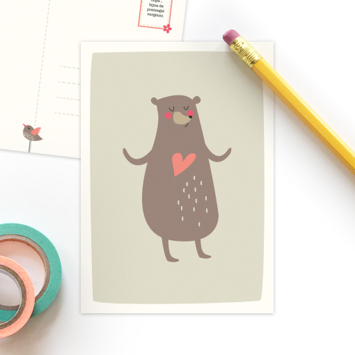 Deze te gekke ansichtkaart (105 x 148 mm) met het gezellige bosbeestje is stoer aan de muur van een loft. Gewoon met een stukje masking tape. Of lief in een lijstje op een kinderkamer. Hij is natuurlijk ook te beschrijven en versturen als kaart. We drukken op hoogwaardig sulfaatkarton dat met zorg is uitgekozen.
