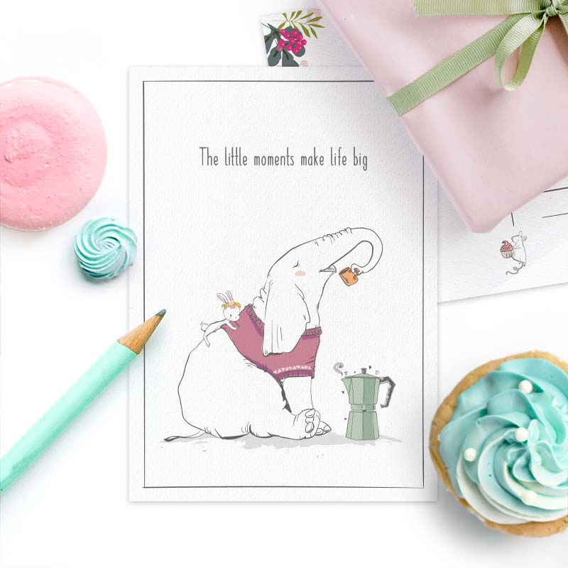 Deze vrolijke postkaart (105 x 148 mm) met de gezellige chaos is een feest om te versturen. Ook leuk als decoratie in een loft of kinderkamer, gewoon los of als complete serie van vier naast elkaar. De eigenwijze dieren en zachte kleuren maken de kaart extra bijzonder. Aan de vormgeving van de achterzijde besteden we minstens zoveel aandacht. We drukken op hoogwaardig sulfaatkarton dat met zorg is uitgekozen.