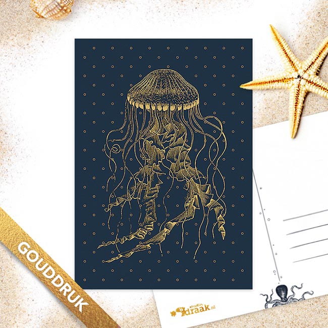 Deze bijzondere postkaart (105 x 148 mm) met het gouden zeedier is een feest om te versturen. Ook leuk als decoratie in een loft of kinderkamer, gewoon los of als complete serie van vier naast elkaar. De gouden foliedruk met prachtige reflecties maakt de kaart extra bijzonder. Aan de vormgeving van de achterzijde besteden we minstens zoveel aandacht. We drukken op hoogwaardig sulfaatkarton dat met zorg is uitgekozen.