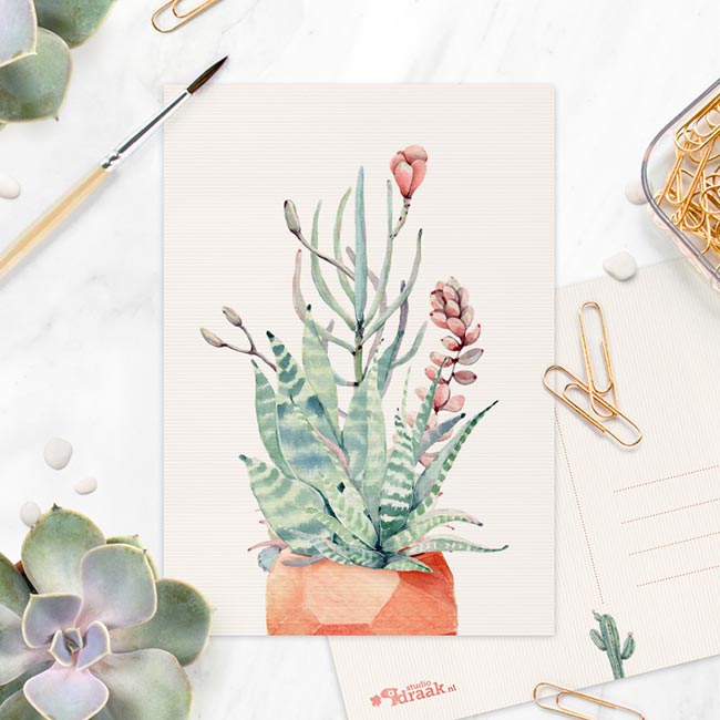 Deze stoere postkaart (105 x 148 mm) met de succulents en cactussen is om verliefd op te worden. Een feest om te versturen, maar ook leuk op de muur van een kinderkamer of stoere loft. We drukken op hoogwaardig sulfaatkarton dat met zorg is uitgekozen. Ook verkrijgbaar als extra voordelige set van vier unieke ontwerpen! We bezuinigen nooit op drukwerk en kiezen altijd voor de beste materialen 🙂