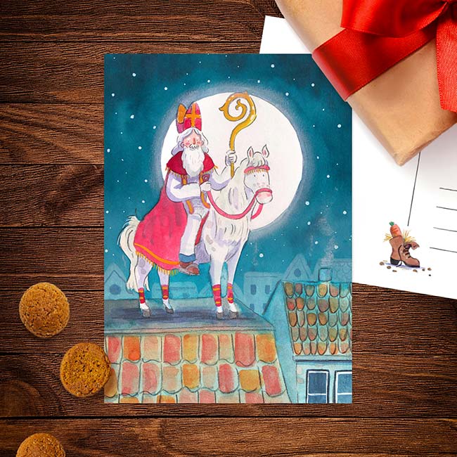 Postkaart ‘Sinterklaas is jarig’ in de maneschijn