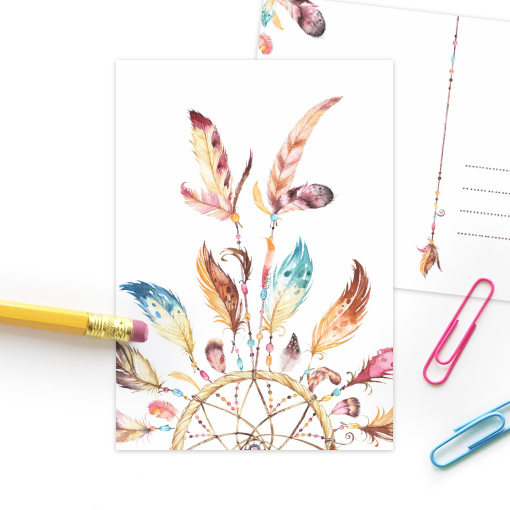Deze vrolijke postkaart (105 x 148 mm) met de kleurrijke dromenvanger  is een feest om te versturen. Maar ook leuk op de muur van een kinderkamer of stoere loft. De gedetailleerde waterverf schilderingen maken de kaart lekker eigentijds. We drukken op hoogwaardig sulfaatkarton dat met zorg is uitgekozen.