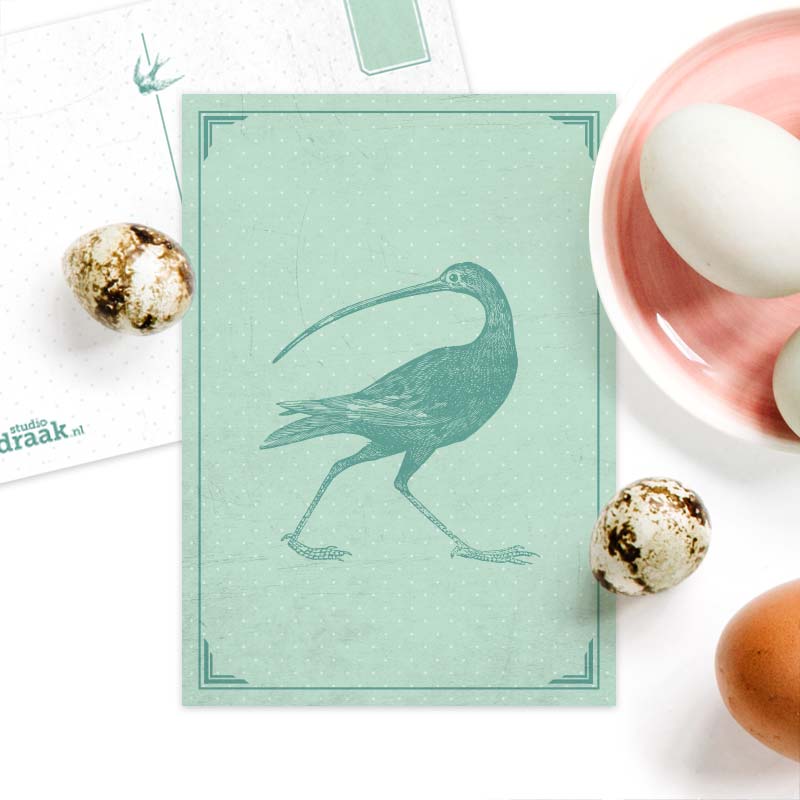 Deze retro postkaart (105 x 148 mm) met de vreemde vogel is een feest om te versturen. Ook leuk als decoratie in een loft of kinderkamer, gewoon los of als complete serie van vier naast elkaar. De eigentijdse kleuren en stippen maken de kaart extra bijzonder. Aan de vormgeving van de achterzijde besteden we minstens zoveel aandacht. We drukken op hoogwaardig sulfaatkarton dat met zorg is uitgekozen.