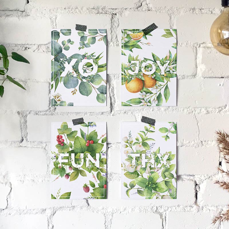Deze kleurrijke set kaarten (105 x 148 mm) met de plantjes en begroeide woorden is om verliefd op te worden. Een feest om te versturen, maar ook leuk op de muur van een kinderkamer of stoere loft. We drukken op hoogwaardig sulfaatkarton dat met zorg is uitgekozen. Ook verkrijgbaar als losse kaarten! We bezuinigen nooit op drukwerk en kiezen altijd voor de beste materialen ?