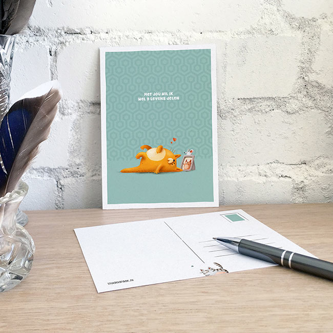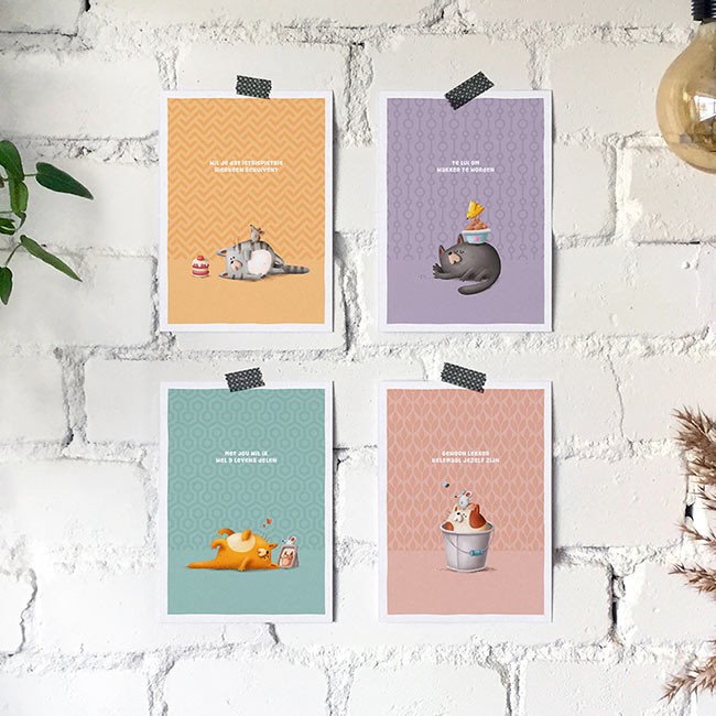 Deze gezellige set kaarten (105 x 148 mm) met de lekker luie huiskatten is om verliefd op te worden. Een feest om te versturen, maar ook leuk op de muur van een kinderkamer of stoere loft. We drukken op hoogwaardig sulfaatkarton dat met zorg is uitgekozen. Ook verkrijgbaar als losse kaarten! We bezuinigen nooit op drukwerk en kiezen altijd voor de beste materialen 🙂