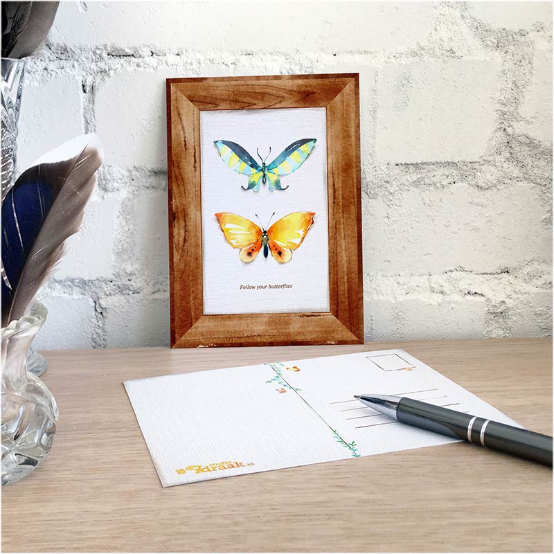 Het formaat is A6 (105×148 mm), de standaard maat voor postkaarten. Goed om te weten is dat de we voor onze kaarten altijd kiezen voor mooie materialen. Omdat het karton enkelzijdig is gestreken, krijg je een mooie matte en wat gladdere voorzijde en een minder gladde achterzijde. En daarmee zijn ze dus perfect te beschrijven!