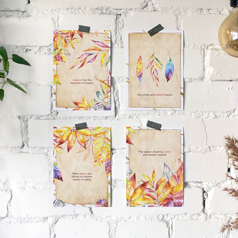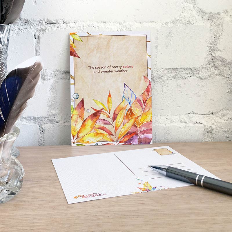 Deze bonte set kaarten (105 x 148 mm) met de kleurrijke herfstbladeren is om verliefd op te worden. Een feest om te versturen, maar ook leuk op de muur van een kinderkamer of stoere loft. We drukken op hoogwaardig sulfaatkarton dat met zorg is uitgekozen. Ook verkrijgbaar als losse kaarten! We bezuinigen nooit op drukwerk en kiezen altijd voor de beste materialen ?