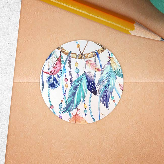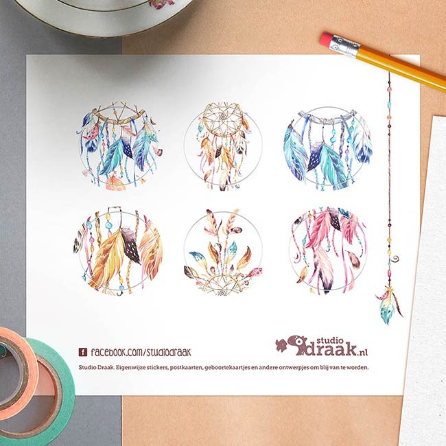 Deze vrolijke set van 6 stickers met de kleurrijke dromenvangers maakt een snailmail pakketje of mooie envelop nóg bijzonderder. Ook leuk op cadeautjes en in schriftjes. We drukken op hoogwaardig PVC-vrij folie met mat laminaat afwerking.