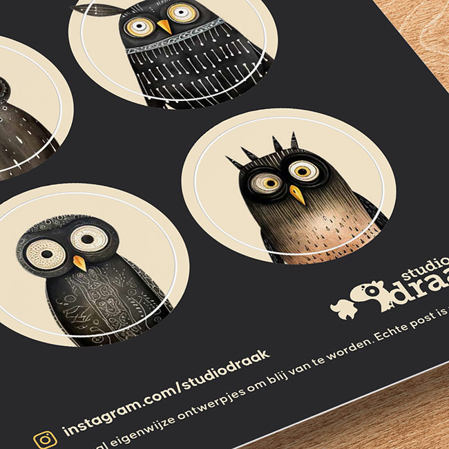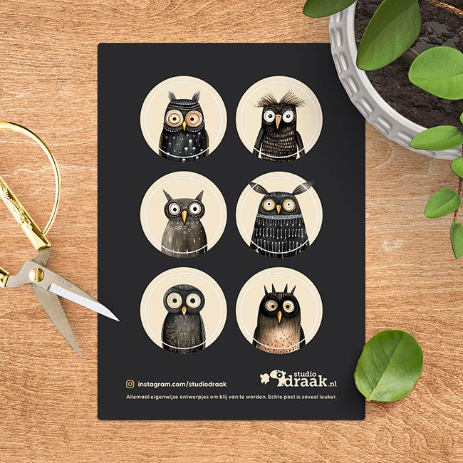 Een A6 stickervel met 6 contourgesneden stickers. De minder goed uitgeslapen uilen maken een snailmail pakketje of mooie envelop éxtra bijzonder. Ook leuk op cadeautjes en in schriftjes. We produceren deze stickers op duurzaam mat 58UM polyester met sterke kleefkracht. Waterbestendig, vuilafstotend en geschikt voor intensief gebruik.