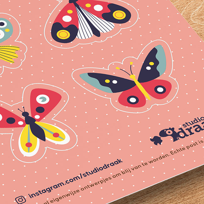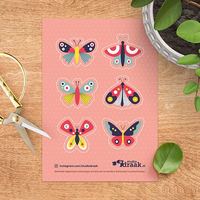 Een A6 stickervel met 6 contourgesneden stickers. De eigentijds gekleurde vlinders maken een snailmail pakketje of mooie envelop éxtra bijzonder. Ook leuk op cadeautjes en in schriftjes. We produceren deze stickers op duurzaam mat 58UM polyester met sterke kleefkracht. Waterbestendig, vuilafstotend en geschikt voor intensief gebruik.