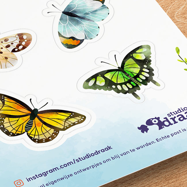 Een A6 stickervel met 6 contourgesneden stickers. De kleurrijke vlinders maken een snailmail pakketje of kerstcadeautje éxtra bijzonder. We produceren deze stickers op duurzaam mat 58UM polyester met sterke kleefkracht. Waterbestendig, vuilafstotend en geschikt voor intensief gebruik.